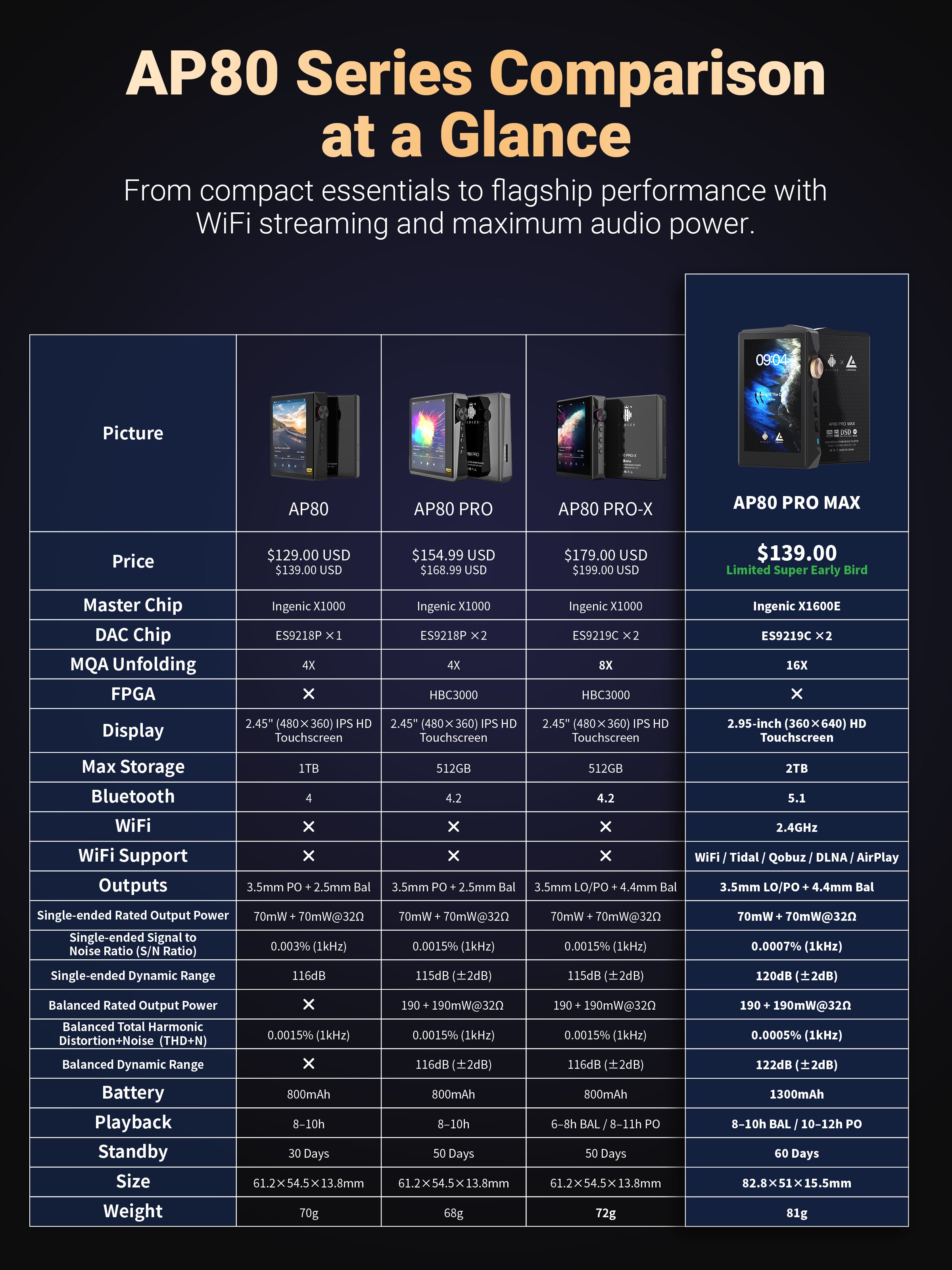 The AP80 PRO MAX is a portable HiFi player designed for music lovers, letting you hear details that your phone can never reveal. Whether it’s the delicate piano melodies, powerful bass, or every breath in a vocal performance, it faithfully reproduces sound with stunning clarity, making you feel like you’re right there at the live performance.