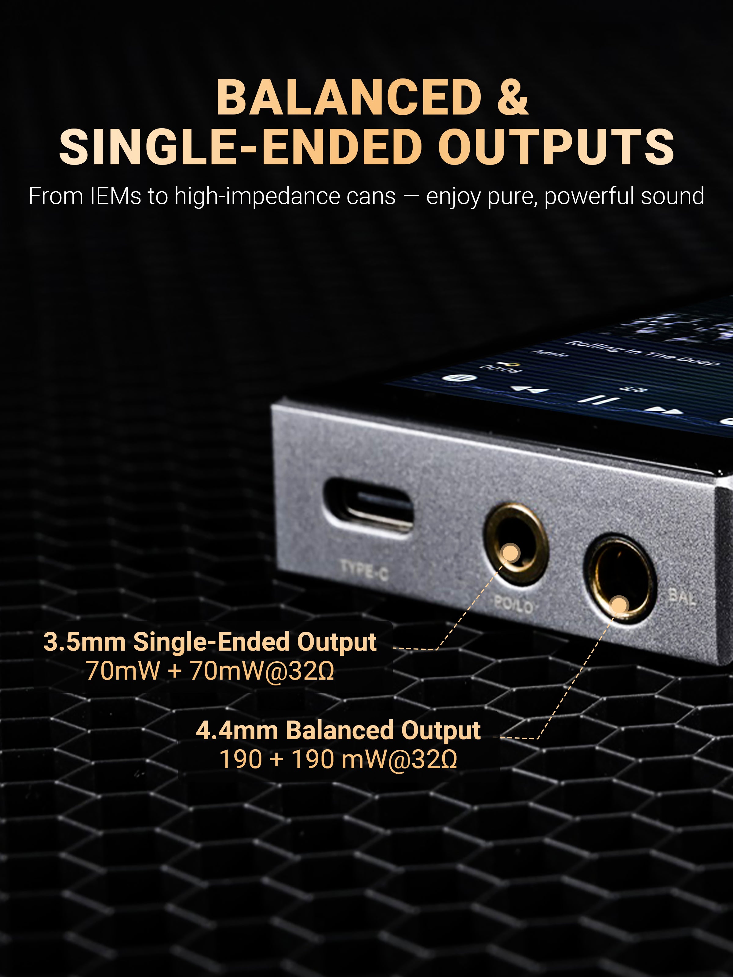 4.4mm Balanced Output: 190 + 190mW @ 32Ω — powerful output with expansive soundstage and exceptional resolution, ideal for high-impedance headphones in home or quiet environments.