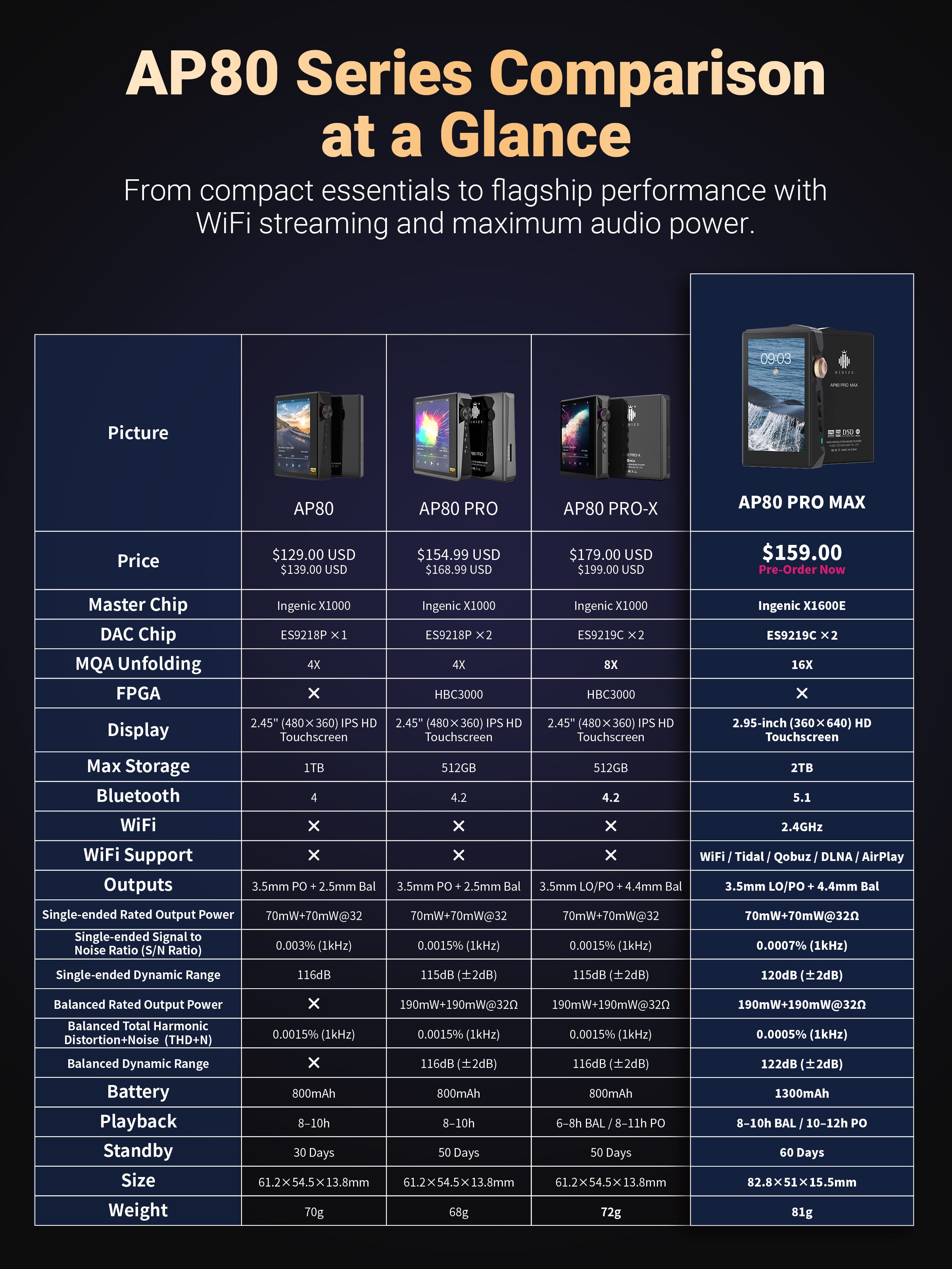 The HIDIZS AP80 PRO MAX delivers studio-quality sound in a compact, pocket-sized design. Enjoy lossless microSD playback, bidirectional Bluetooth 5.1, and 2.4GHz Wi-Fi streaming for Tidal, Qobuz, DLNA & AirPlay — all in one device.