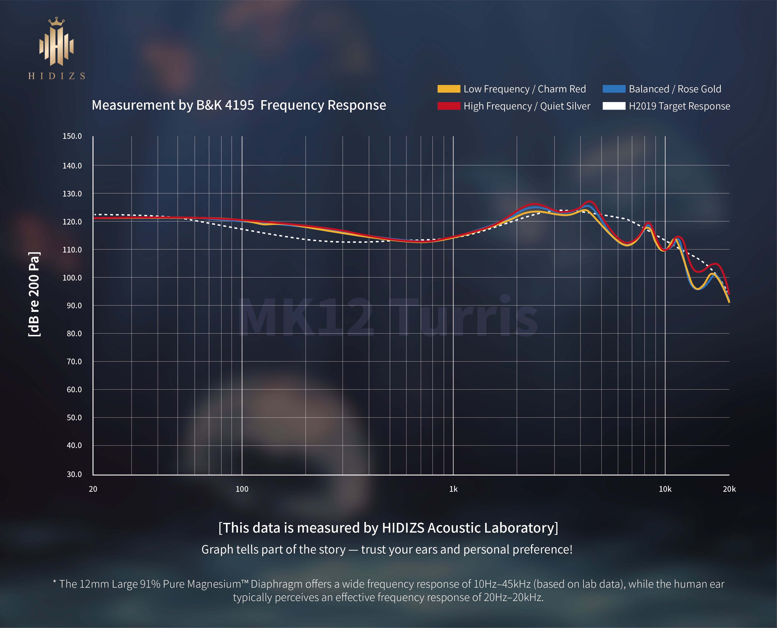 Precision-tuned at HIDIZS Acoustic Laboratory with G.R.A.S. coupler calibration, the MK12 Turris delivers a B&K HATS-measured frequency response that not only matches the H-2019 target curve, but also achieves a Hi-Res 10Hz–45kHz super-wide frequency range, it offers superior resolution, extended treble, and expansive soundstage – faithfully reproducing audio sources with studio-grade fidelity.