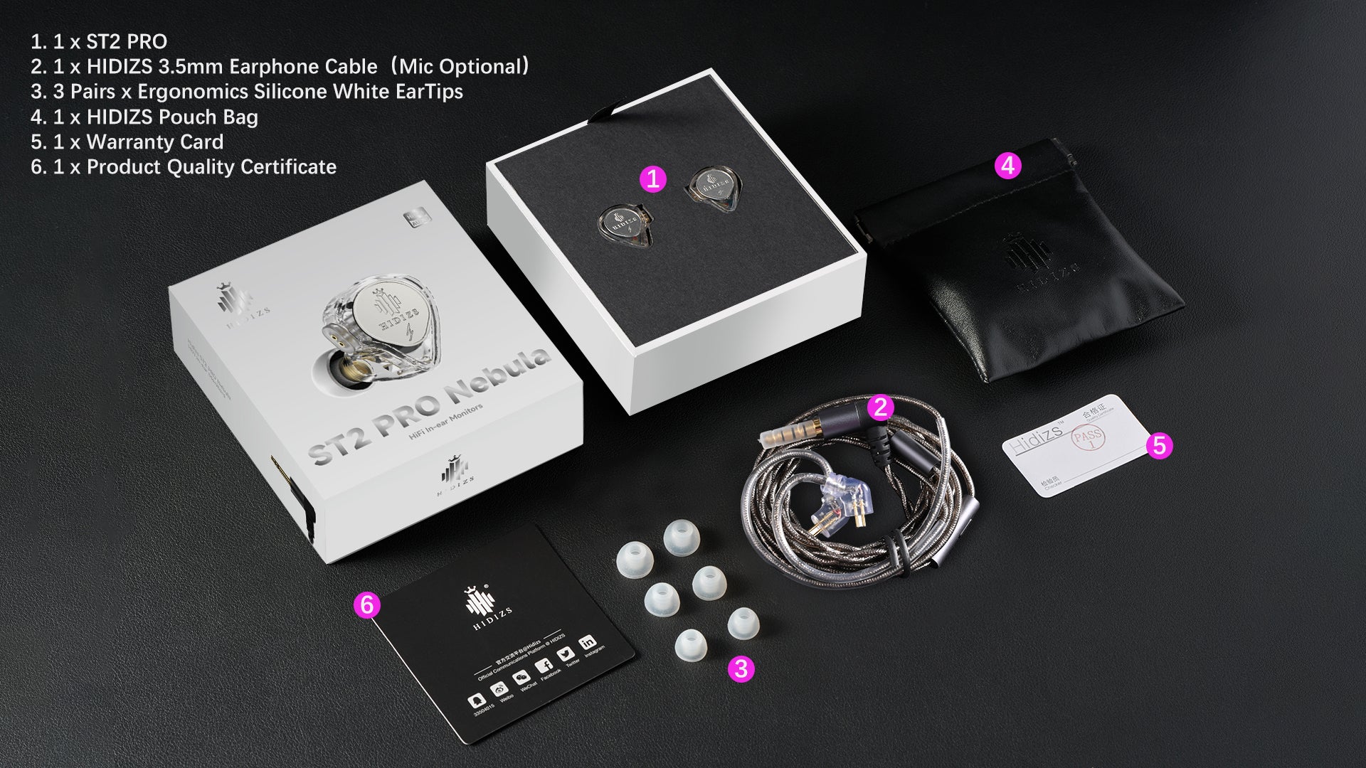 The ST2 PRO Nebula digital HiFi In-ear earphones are calibrated and tuned by the HIDIZS Acoustic Laboratory, adhering to the H-2019 target curve for accurate audio response. They offer balanced tonality, powerful bass, rich midrange, and moderate high-frequency extension, meeting Hi-Res audio standards for a HiFi-grade listening experience.
