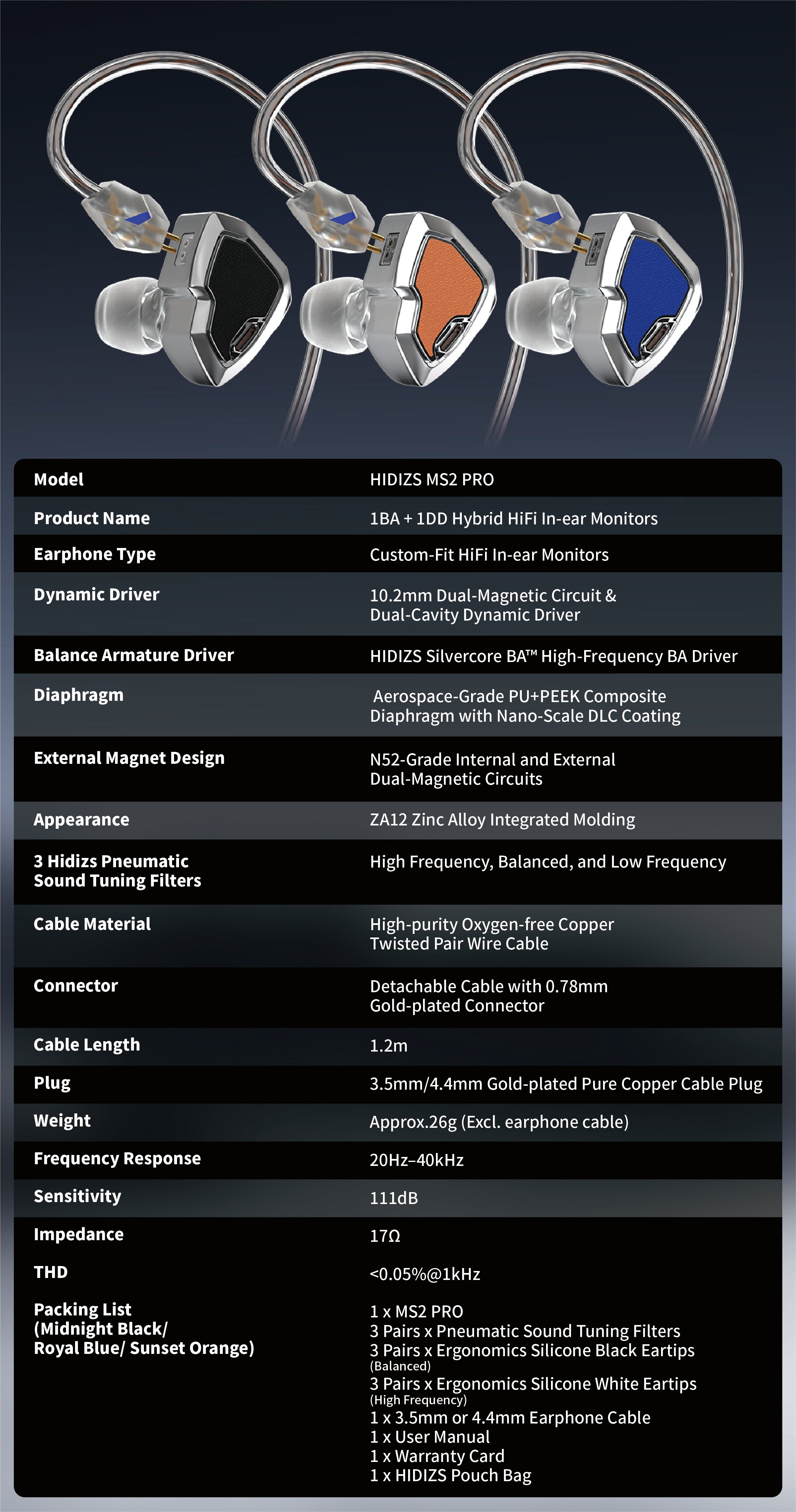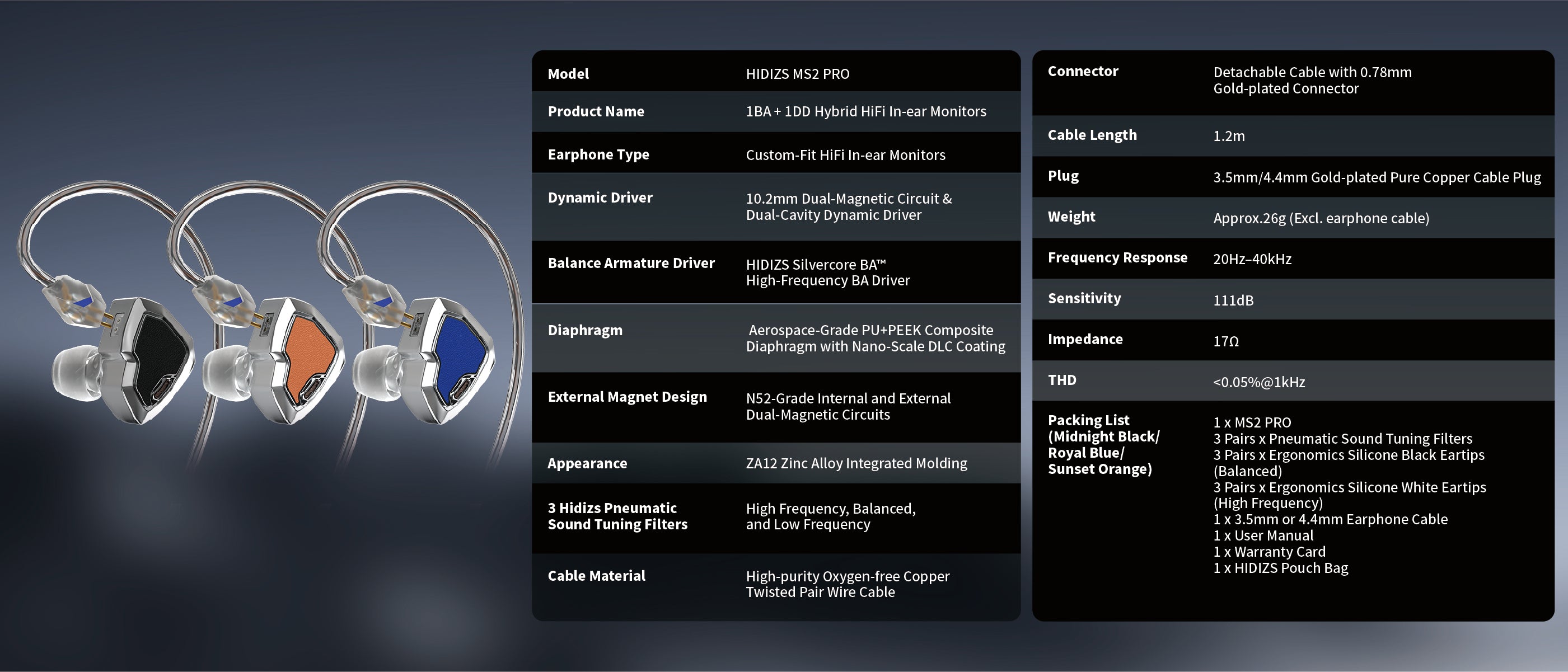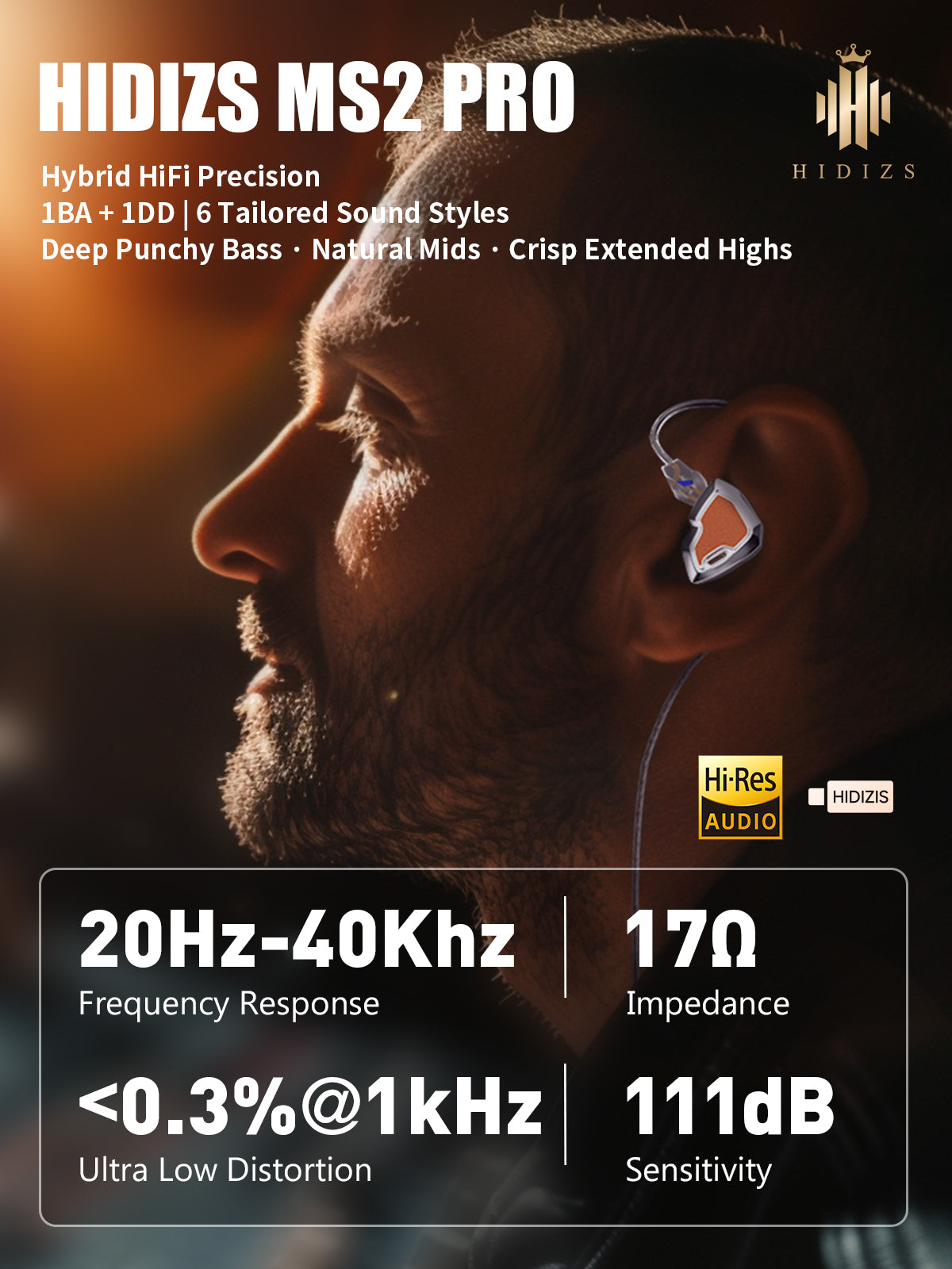 With 17Ω impedance and 111dB sensitivity, the MS2 PRO is ready to sing with anything —from smartphones and dongle DACs to high-end DAPs and amplifiers.