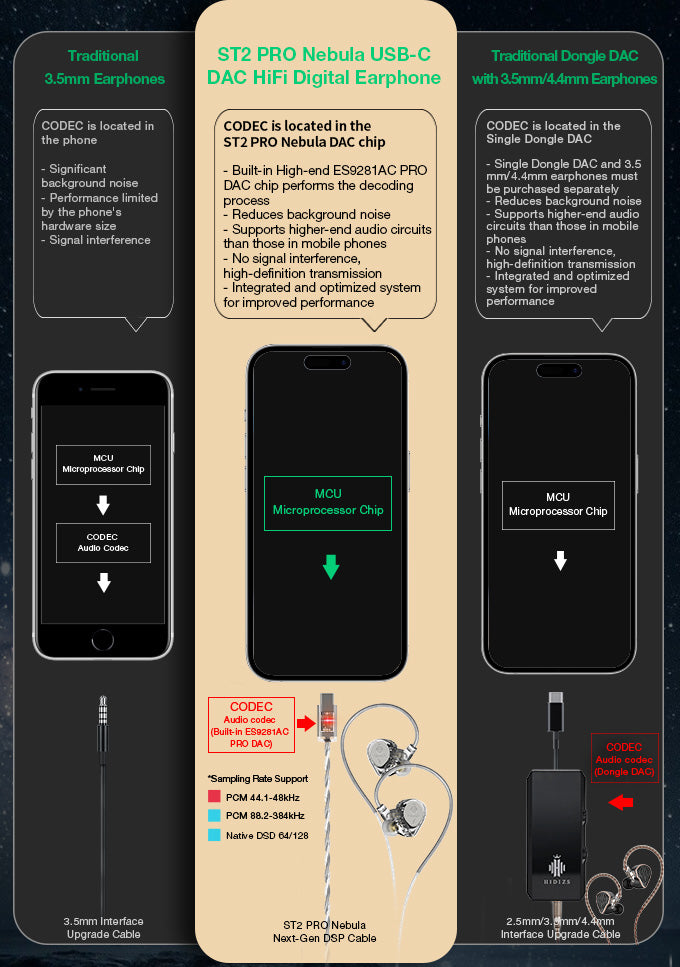 The ST2 PRO Nebula version, USB-C DAC HiFi Digital In-ear Earphones feature the ES9218AC PRO decoding chip, providing exceptional audio quality with a PCM sampling rate of 32-bit/384KHz and Native DSD 64/128.